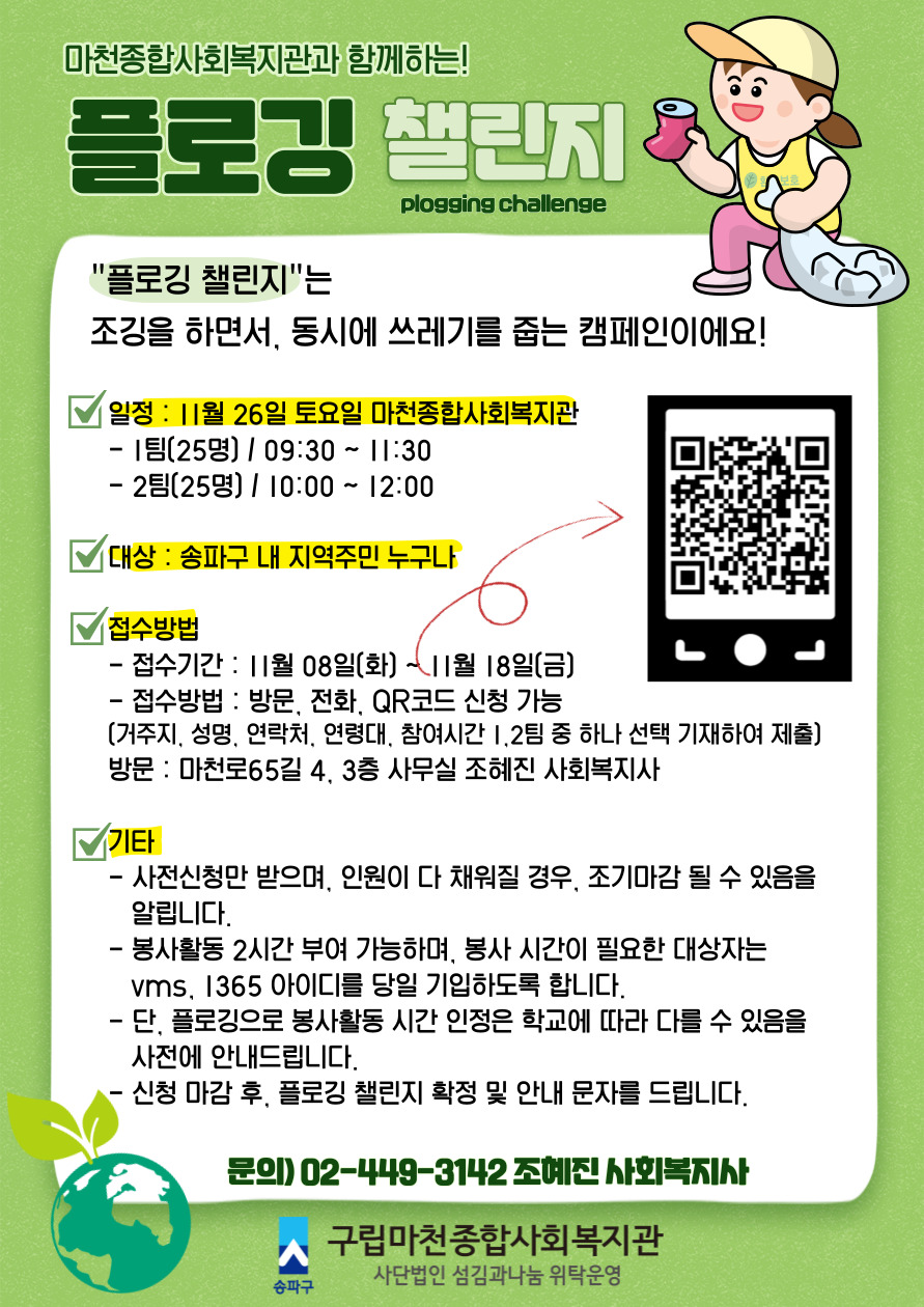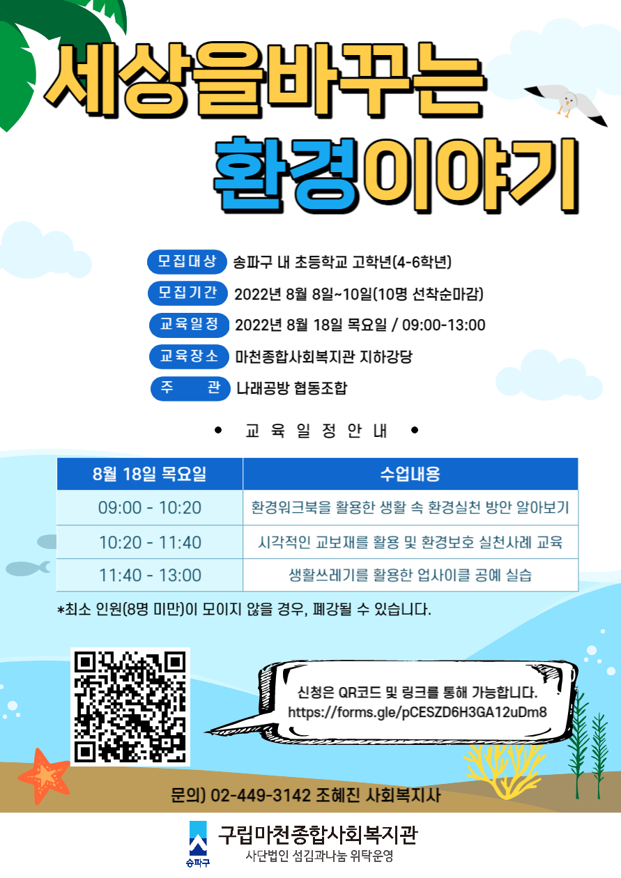 ¾È³çÇϼ¼¿ä. ¸¶ÃµÁ¾ÇÕ»çȸº¹Áö°üÀÔ´Ï´Ù.¼ÛÆÄ±¸ û¼Ò³âµéÀÇ ÀÚ¹ßÀû ź¼Ò Á߸³À» ½ÇõÇϱâ À§ÇÑ ÇÁ·Î±×·¥À» ÁøÇàÇϰíÀÚ ÇÕ´Ï´Ù.1ȸ±â ±³À°À¸·Î ÁøÇà µÇ´Ï ¸¹Àº °ü½É°ú Âü¿©¹Ù¶ø´Ï´Ù!- ±³À°ÀÏÁ¤ : 2022.08.18(¸ñ) / 09:00-13:00- ½Åû¹æ¹ý : È«º¸Áö QRÄÚµå Á¢¼Ó ¹× ¸µÅ©(https://forms.gle/pCESZD6H3GA12uDm8)Á¢¼ÓÇÏ¿© ½Åû¼ Á¦Ãâ- ¹®ÀÇ : ¸¶Ãµ1µ¿ÆÀ Á¶ÇýÁø »çȸº¹Áö»ç / 02-449-3142