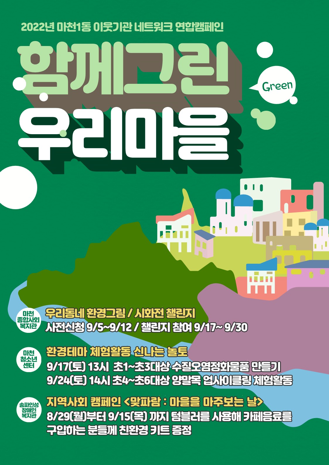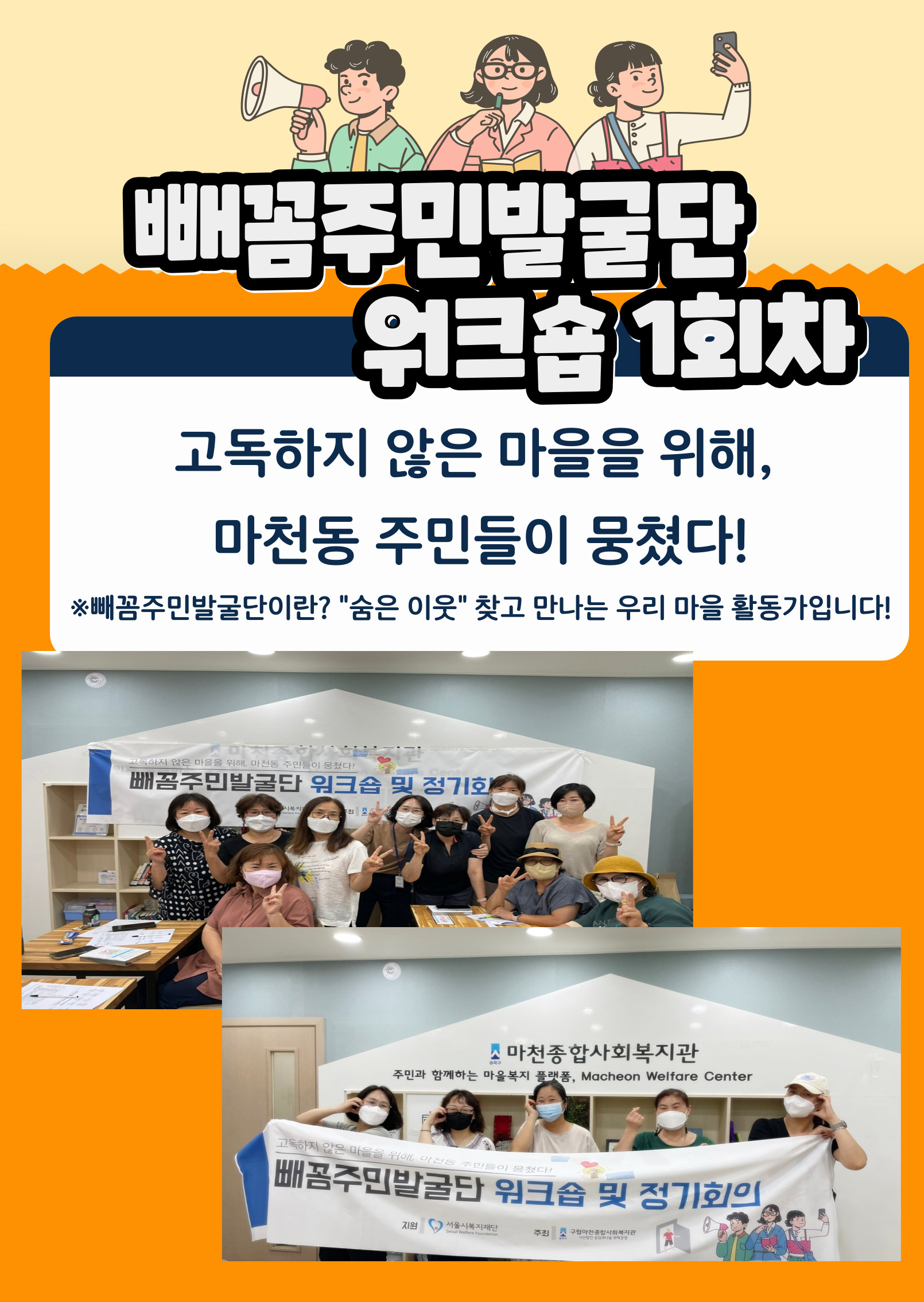 ¾È³çÇϼ¼¿ä. ¸¶ÃµÁ¾ÇÕ»çȸº¹Áö°ü Á¶ÇýÁø »çȸº¹Áö»çÀÔ´Ï´Ù:)¸¶Ãµ1µ¿¿¡ ´Ù¾çÇÑ ±â°üµéÀÌ ÇÔ²² ÇÏ´Â °Í, ¾Ë°í °è¼Ì³ª¿ä? 'ÇÔ²²±×¸° ¿ì¸®¸¶À»'À̶ó´Â ÁÖÁ¦·Î ¸¶Ãµ1µ¿ÀÇ ÀÌ¿ô±â°üµéÀÌ ¸ð¿© ȯ°æ°ú °ü·ÃµÈ 縰Áö, üÇèȰµ¿, Ä·ÆäÀÎÀ» ÁøÇàÇϰíÀÚ ÇÕ´Ï´Ù.Ä·ÆäÀÎÀº ÇÏ´Ü¿¡ À̹ÌÁö¿¡ µî·ÏµÈ QRÄڵ带 ½ºÄµÇÏ¼Å¾ß ½Åû ¹× Âü¿©°¡ °¡´ÉÇÕ´Ï´Ù. ¹®ÀÇ »çÇ×Àº °¢ ´ã´çÀÚ¿¡°Ô ¿¬¶ôÇØÁÖ½Ã¸é °¨»çµå¸®°Ú½À´Ï´Ù. ÇÔ²²ÇÏ´Â ¿ì¸® ¸¶À», ¿ì¸® ÁÖ¹ÎÀÌ µÇ¾î ¸¹Àº °ü½É°ú Âü¿© ...