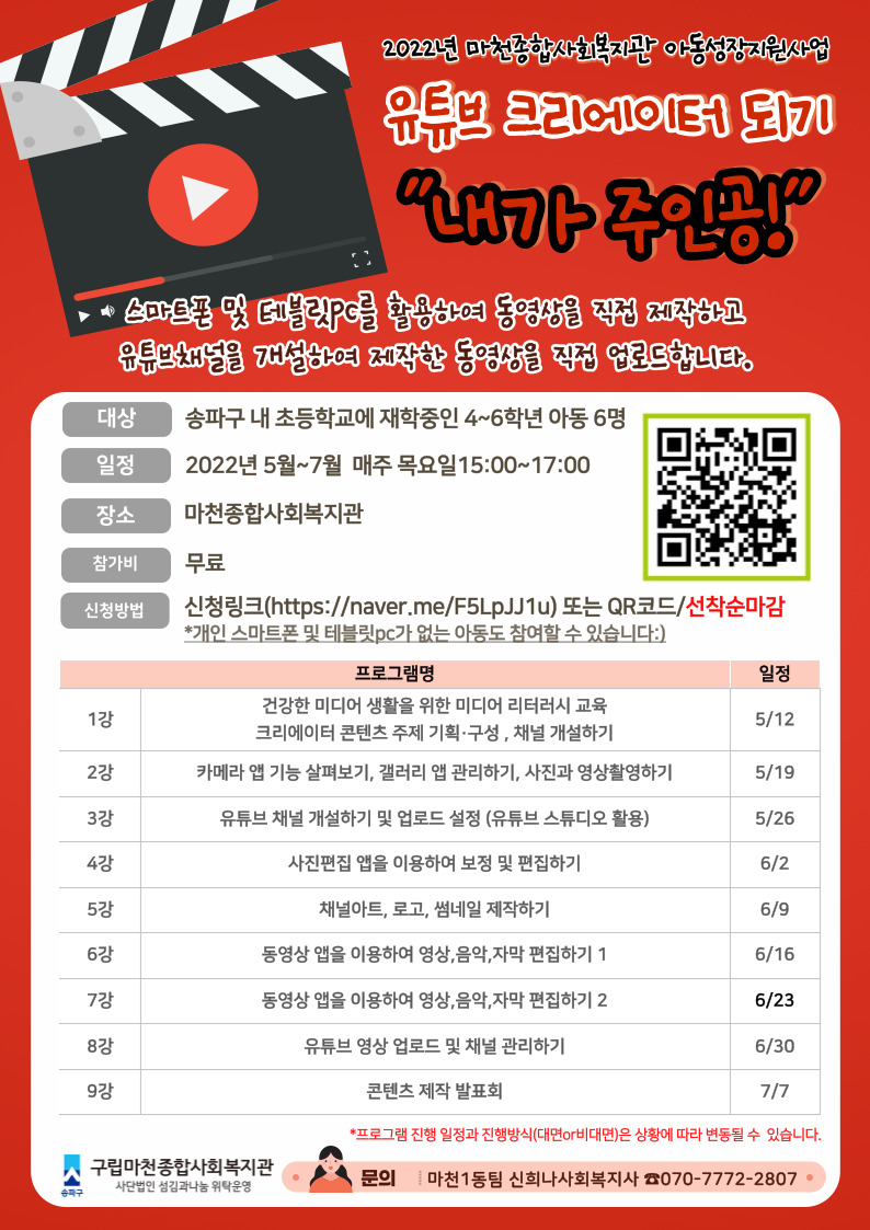 ¾È³çÇϼ¼¿ä, ¸¶ÃµÁ¾ÇÕ»çȸº¹Áö°ü ÀÔ´Ï´Ù!º» °ü¿¡¼´Â ¾Æµ¿ÀÇ °Ç°ÇÑ ¼ºÀå°ú ¹ß´ÞÀ» µµ¸ðÇϱâ À§ÇØ ¾Æµ¿¼ºÀåÁö¿ø»ç¾÷À» ÁøÇàÇϰí ÀÖ½À´Ï´Ù.¿Ã ÇØ´Â °Ç°ÇÑ ¹Ìµð¾î »ýȰÀ» À§ÇÑ ±³À°°ú, À¯Æ©ºê Å©¸®¿¡ÀÌÅÍ µÇ±â °ü·Ã ±³À°À» ÁøÇàÇÏ¿À´Ï°ü½ÉÀÖ´Â ¾Æµ¿Àº È«º¸Áö¸¦ Âü°íÇÏ½Ã¾î ½ÅÃ»ÇØÁֽñ⠹ٶø´Ï´Ù:)´ë»ó: ¼ÛÆÄ±¸ ³» ÃʵîÇб³¿¡ ÀçÇÐÁßÀÎ 4~6ÇгâÀÏÁ¤:2022.5¿ù~7¿ù/¸ÅÁÖ ¸ñ¿äÀÏ 15:00~17:00 *»ó¼¼³»¿ë ÷ºÎÆÄÀÏ Âü°í½Åû¹æ¹ý: ½Åû¸µÅ©(https://naver.me/F5...