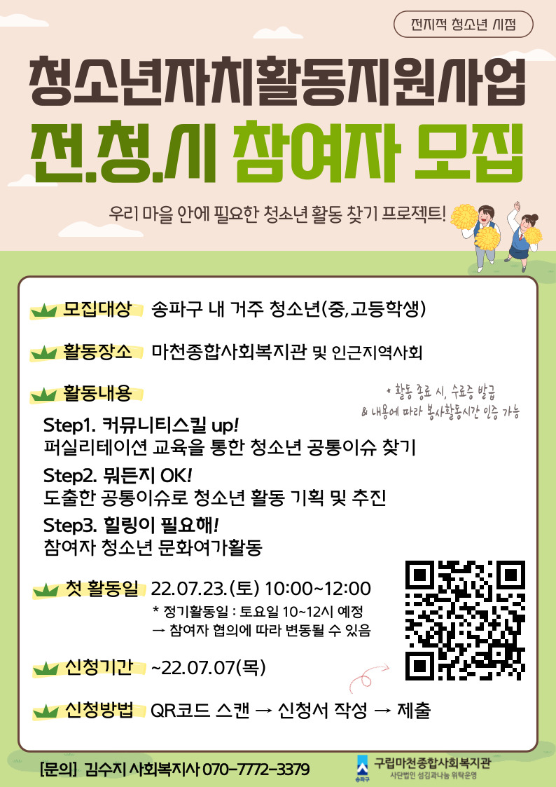 ¾È³çÇϼ¼¿ä ¸¶ÃµÁ¾ÇÕ»çȸº¹Áö°üÀÔ´Ï´Ù! ¸¶ÃµÁ¾ÇÕ»çȸº¹Áö°ü¿¡¼´Â û¼Ò³âµéÀÇ °Ç°ÇÑ ¼ºÀåÀ» À§ÇÏ¿© û¼Ò³âÀÚġȰµ¿Áö¿ø»ç¾÷À» ½Ç½ÃÇÕ´Ï´Ù. 7¿ù ¿©¸§¹æÇкÎÅÍ 11¿ù±îÁö ¾ËÂù Ȱµ¿À» ÇÔ²² ¸¸µé¾î°¥ ¼ö ÀÖµµ·Ï ¸¹Àº °ü½É°ú Âü¿© ºÎʵ右´Ï´Ù:) ´ë»ó : ¼ÛÆÄ±¸ ³» û¼Ò³â(Áß,°íµîÇлý)ÀÏÁ¤ : 2022.07. ~ 2022.11 (ù Ȱµ¿ÀÏ : 2022.07.23.Åä 10:00~12:00)Âü°¡¹æ¹ý : QRÄÚµå ½ºÄµ ÈÄ ½Åû¼ ÀÛ¼º, Á¦Ãâ¹®ÀÇ : À§·Êµ¿ÆÀ ±è¼öÁö »çȸº¹Áö»ç 070-...