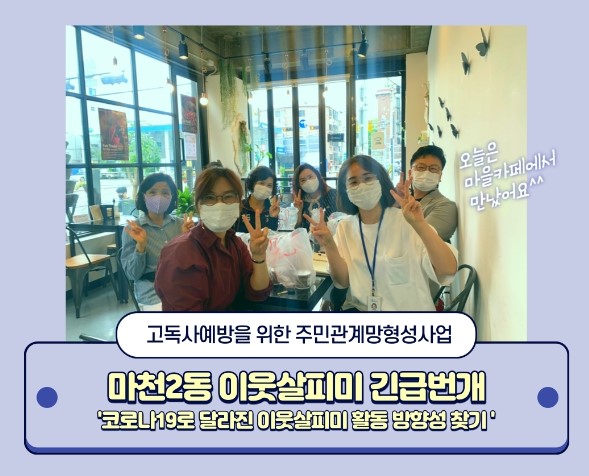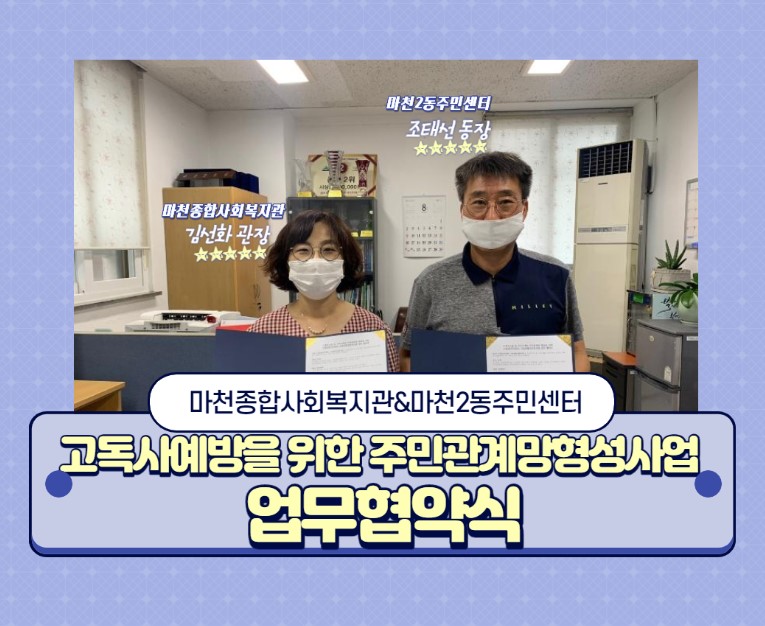 ¾È³çÇϼ¼¿ä! ¸¶ÃµÁ¾ÇÕ»çȸº¹Áö°ü Á¤¼öÁø»çȸº¹Áö»çÀÔ´Ï´Ù.À̹ø Æ÷½ºÆÃÀº Áö³ 8¿ù 3ÀÏ(¿ù) , ¸¶Ãµ2µ¿Áֹμ¾ÅÍ¿¡¼ ÁøÇàµÈ °íµ¶»ç¿¹¹æÀ» À§ÇÑ Áֹΰü°è¸Á Çü¼º»ç¾÷ ¾÷¹«Çù¾à½Ä ÇöÀå ÀÔ´Ï´Ù! '¼¿ï½Ã°ø¸ð»ç¾÷'ÀÇ Çϳª·Î ¹Î°ü³×Æ®¿öÅ© Çù·Â»ç¾÷ÀÎ °íµ¶»ç¿¹¹æÀ» À§ÇÑ Áֹΰü°è¸ÁÇü¼º»ç¾÷Àº Áö¿ª ³» »çȸÀû°í¸³À» ¸·°í, °íµ¶ÇÑ Á×À½À¸·Î ³»¸ô¸®Áö ¾Ê´Â °Ç.°.ÇÑ Áö¿ª¹®È¸¦ ¸¸µé±â À§ÇÑ, ÀÌ¿ôÀÇ °ü½ÉÀ¸·Î~ ÀÌ¿ô°úÀÇ °ü°è¸ÎÀ½À¸·Î~°ü°è¸¦ ȸº¹Çϰí Áö...