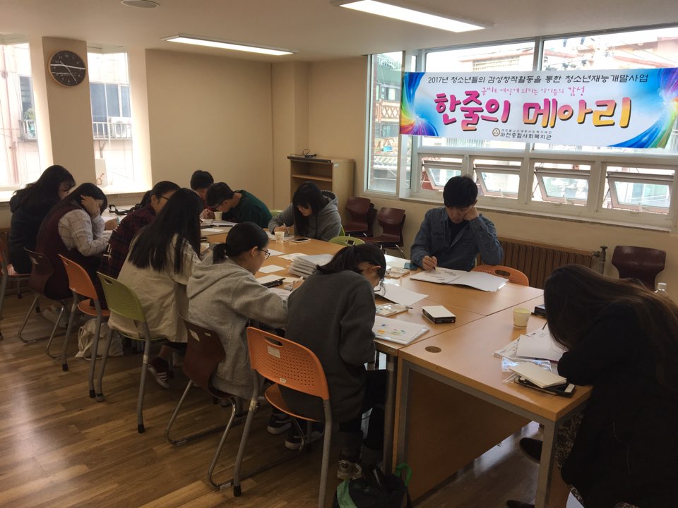 Áö³ 10¿ù 14ÀÏ(Åä), ¸¶ÃµÁ¾ÇÕ»çȸº¹Áö°ü¿¡¼´Â Áö¿ª»çȸ ³» û¼Ò³âµéÀÇ °¨¼ºÃ¢ÀÛȰµ¿À» À§ÇÑ ²ÞŰ¿ì±â ÇÁ·ÎÁ§Æ®·Î û¼Ò³âÀç´É°³¹ß ¡®ÇÑÁÙÀǸ޾Ƹ®2±â' 10ȸÂ÷°¡ ÁøÇàµÇ¾ú½À´Ï´Ù. º» »ç¾÷Àº ±Û¾²±â¿¡ °ü½É Àִ û¼Ò³âµéÀÌ ¸ð¿© Àü¹®ÀûÀΠ͏®±×¶óÇÇ Ã¢ÀÛ±³À°È°µ¿À» ¹ÞÀ¸¸ç, ÀÚ½ÅÀÇ °¨Á¤À» ±ÛÀÚ¿¡ Ç¥ÇöÇÏ´Â °úÁ¤À» ÅëÇØ ¶Ç·¡Áý´Ü °ü°èÇü¼º ¹× ÀÚ±âÇ¥Çö·ÂÀ» ÃËÁø½ÃÄÑ ÀÚÁ¸°¨À» Çâ»ó½Ã۰íÀÚ ÇÕ´Ï´Ù. ±ÝÀÏ 10ȸÂ÷ ¼ö¾÷¿¡¼´Â ¡®±Û...