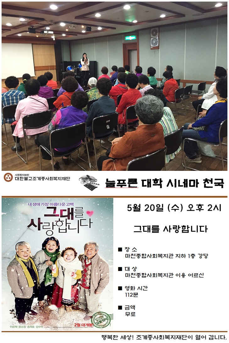 2015³â 5¿ù 20ÀÏ (¼ö), ¸¶ÃµÁ¾ÇÕ»çȸº¹Áö°ü ÁöÇÏ 1Ãþ °´ç¿¡¼ ¿µÈ »ó¿µ ¼ºñ½º ¡®¸¶Ãµ ½Ã³×¸¶ õ±¹¡¯ÀÌ ÁøÇàµÇ¾ú½À´Ï´Ù. º» Çà»ç¿¡´Â Áö¿ª»çȸ ³» ¾î¸£½Å 37¸íÀÌ Âü¼®ÇÏ¿´À¸¸ç ¿µÈ ¡®±×´ë¸¦ »ç¶ûÇÕ´Ï´Ù¡¯¸¦ ½ÃûÇÏ¿´½À´Ï´Ù. ¿µÈ »ó¿µÀ» ÅëÇØ ¾î¸£½ÅµéÀÇ ÀÏ»ó¿¡ È°·ÂÀ» ´õÇØµå¸± ¼ö ÀÖ¾ú°í ¿µÈ °¨»óÆò¿¡ ´ëÇÑ À̾߱⸦ ³ª´©´Â µî Áø¼ÖÇÑ À̾߱⸦ ³ª´ ¼ö ÀÖ´Â ÀǹÌÀÖ´Â ½Ã°£ÀÌ µÇ¾ú½À´Ï´Ù. ¾ÕÀ¸·Î ¸¶ÃµÁ¾ÇÕ»çȸ...