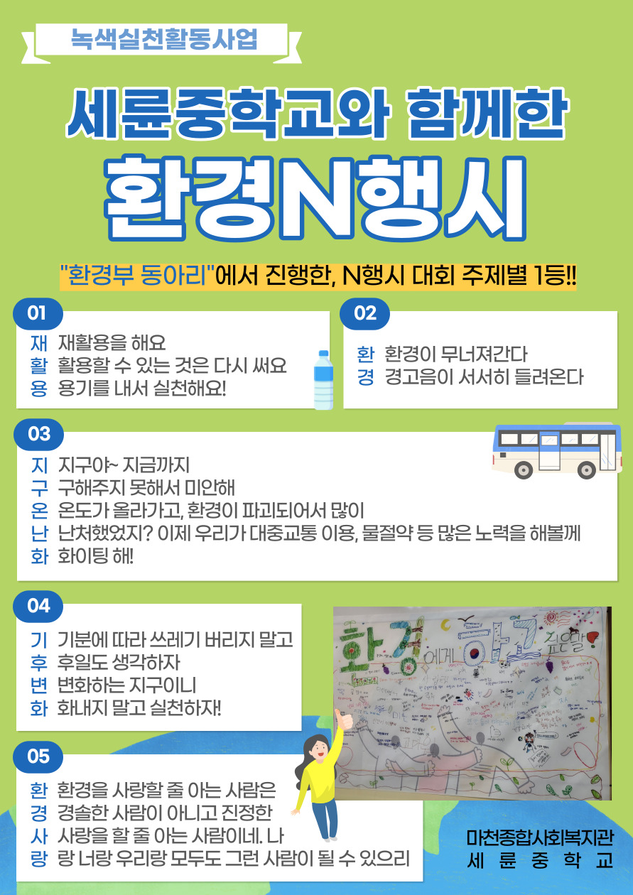 ¾È³çÇϼ¼¿ä. ¸¶ÃµÁ¾ÇÕ»çȸº¹Áö°üÀÔ´Ï´Ù.7¿ù 3ÀÏ(¿ù) ~ 5ÀÏ(¼ö) ±îÁö 3ÀÏ µ¿¾È ¼¼·ûÁßÇб³ ȯ°æºÎ µ¿¾Æ¸®¿Í ÇÔ²² Ä·ÆäÀÎÀ» ÁøÇàÇß½À´Ï´Ù.±× Áß, ¾ÆÀ̵éÀÌ Àû±ØÀûÀ¸·Î Âü¿©ÇØÁØ È¯°æ NÇà½Ã ÁÖÁ¦º° 1µîÀ» »Ì¾Æº¸¾Ò½À´Ï´Ù :)ȯ°æ¿¡ ´ëÇØ °ü½ÉÀ» °¡Áö°í, ÇÔ²²ÇØÁØ Ä£±¸µé ¸ÚÁ®¿ä~!